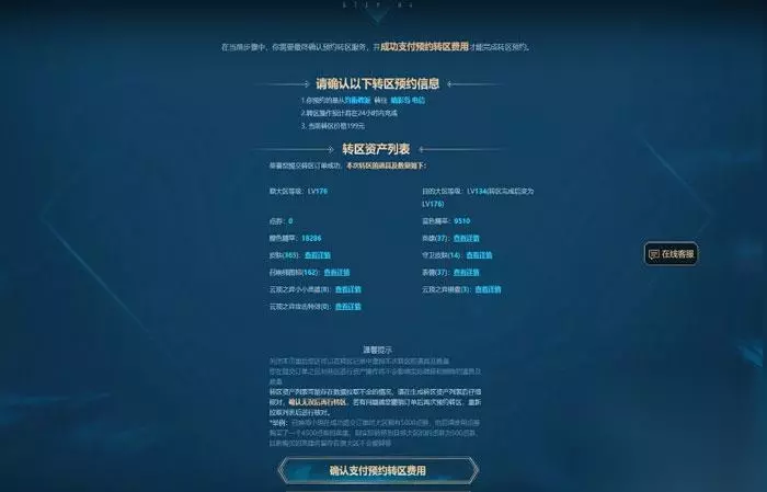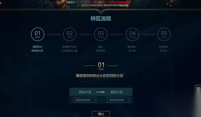 转区的流程 在转区时,会有提示,分为五部:选择转入和转出大区,然后系统会检测当前的账号状态,以及其他转区的预约人数,验证密保手机,确认付费,最后就可以查询进度了。