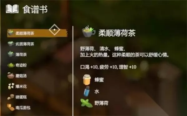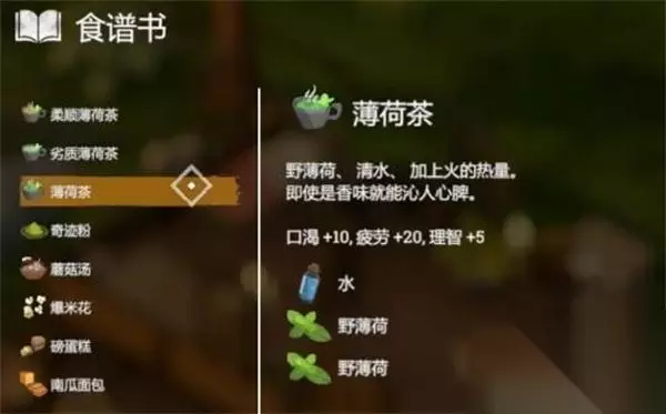 17、【柔顺薄荷茶】 效果:口渴+10,疲劳+10,理智+10 配方:蜂蜜+水+野薄荷