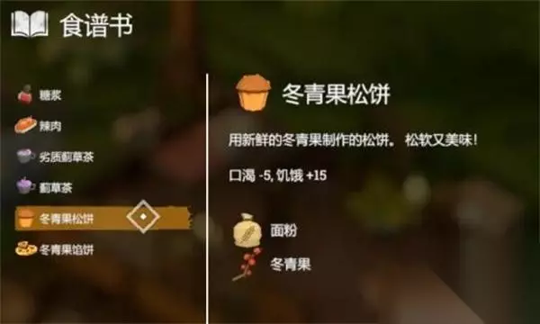29、【冬青果松饼】 效果:口渴-5、饥饿:+15 配方:1*面粉+1*冬青果