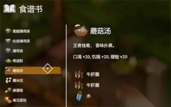 21、【蘑菇汤】 效果:口渴+20、饿+20、理+20 配方:2*牛肝菌+1*水