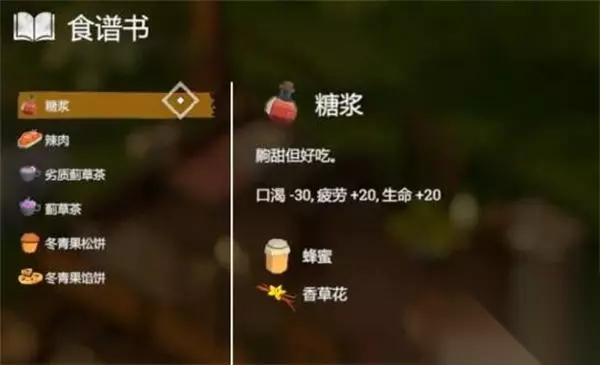 25、【糖浆】 效果:口渴+30、疲命+20、生命+20 配方:1*蜂蜜+1*香草花