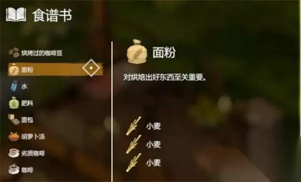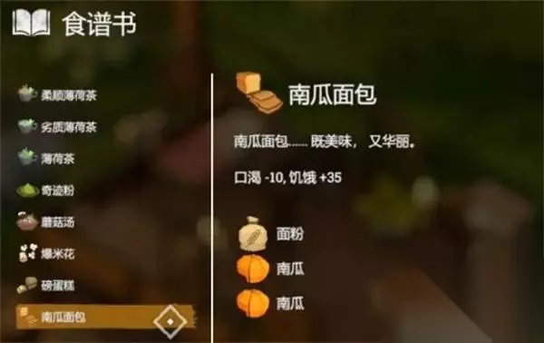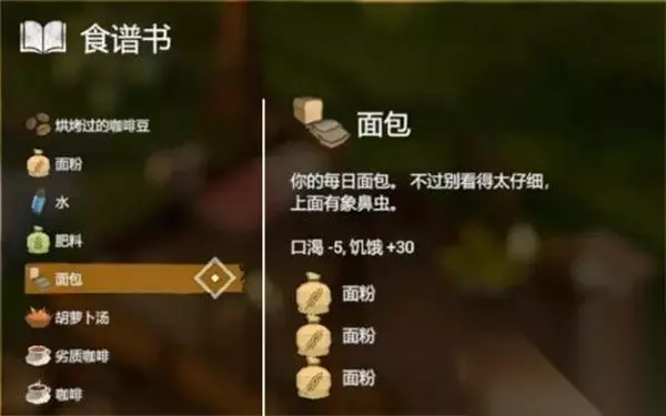 5、【面包】 效果:口渴-5,饥饿+30 配方:3*面粉