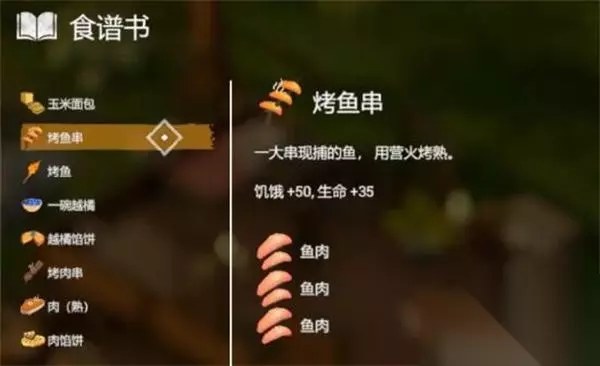 10、【烧鱼串】 效果:饥饿+50,生命+35 配方:3*鱼肉