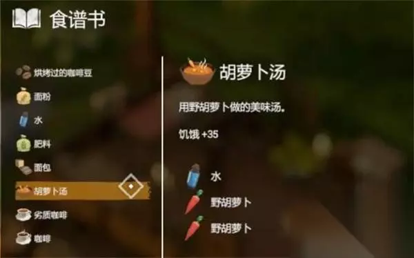 6、【胡萝卜汤】 效果:饥饿+35 配方:水+2*野胡萝卜