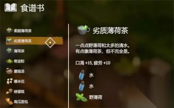18、【劣质薄荷茶】 效果:口渴+15、疲劳+10 配方:2*水+1*野薄荷