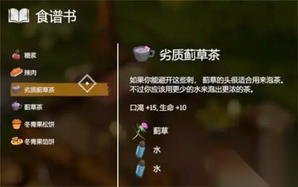 27、【劣质蓟草茶】 效果:口渴+15、生命+10 配方:1*蓟草+2*水