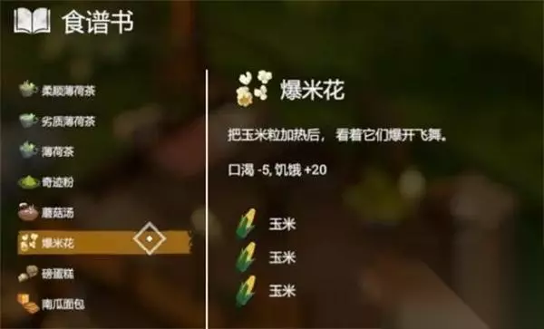 22、【爆米花】 效果:口渴-5、饥饿+20 配方:3*玉米