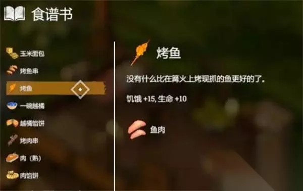 11、【烤鱼】 效果:饥饿+15,生命=10 配方:鱼肉