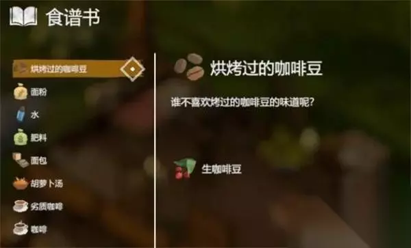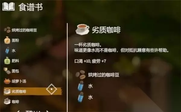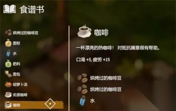 8、【咖啡】 效果:口渴+5,疲劳+15 配方:2*烧烤过的咖啡豆+水