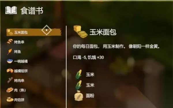 9、【玉米面包】 效果:口渴-5,饥饿+30 配方:2*玉米+面粉