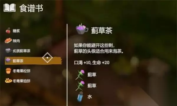 28、【蓟草茶】 效果:口渴+10、生命+20 配方:2*蓟草+1*水