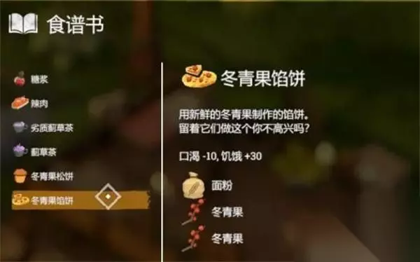 30、【冬青果馅饼】 效果:口渴-10、饥饿+30 配方:1*面粉+2*冬青果