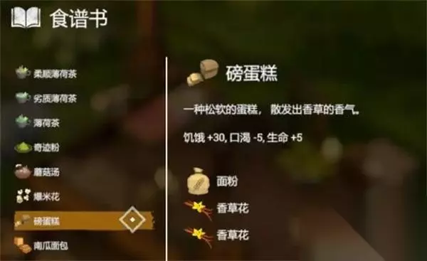 23、【磅蛋糕】 效果:饥饿:+30 配方:1*面粉+2*香草花