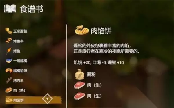 16、【肉馅饼】 效果:饥饿+20,口渴-5,理智+10 配方:1*面粉+2*生肉