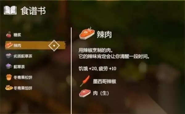 26、【辣肉】 效果:饥饿+20、疲劳+10 配方:1*墨西哥辣椒+1*生肉