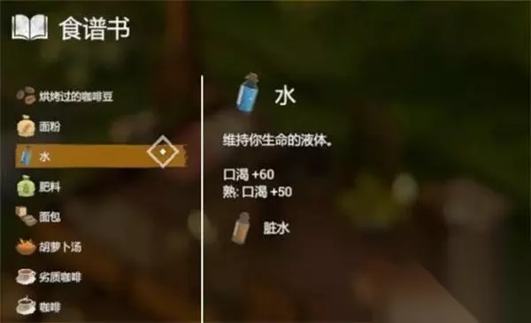 3、【水】 效果:口渴+60、熟:口渴+50、 配方:脏水