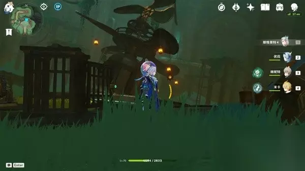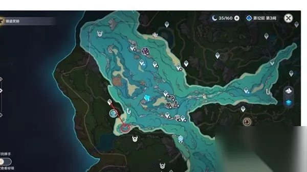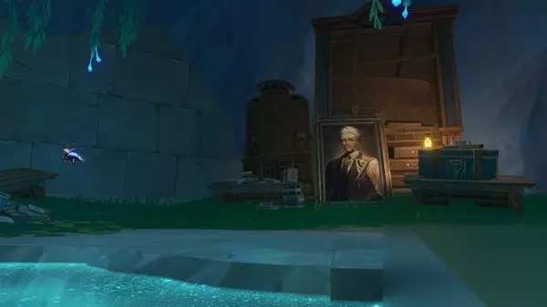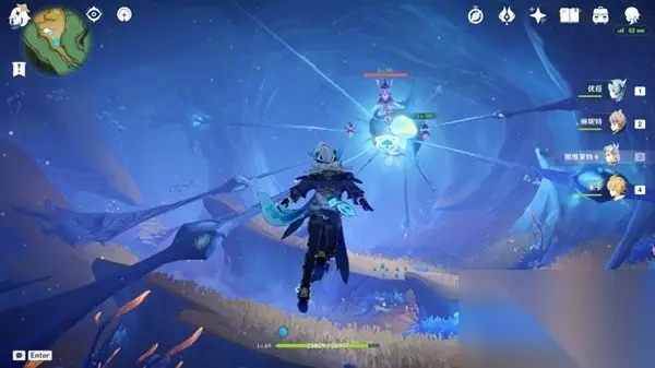 击败后获得成就:打破时间抢和一个华丽宝箱,同时出现神秘矿石。 该区域的水体会让角色持续扣血,战斗时注意复苏水团位置。使用异化水母的技能战斗。第二个矿石 在下图点位进入水下,不断深入洞穴。 可以接取到世界任务——海渊封缠的乖离光。