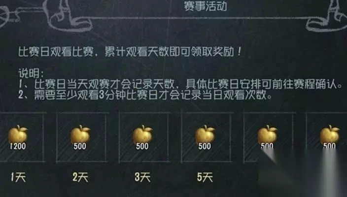 金苹果是第五人格赛事系统用来兑换奖励的道具,在游戏内观看比赛直播也可以根据观看天数获得一些金苹果,在季后赛正确预测冠军有2000金苹果,正确预测FMVP也有2000金苹果,赛事期间还可以下注比赛,下注正确可以获得大量金苹果,需要注意的是,金苹果仅在赛事期间可以获得,休赛期是没有金苹果的。