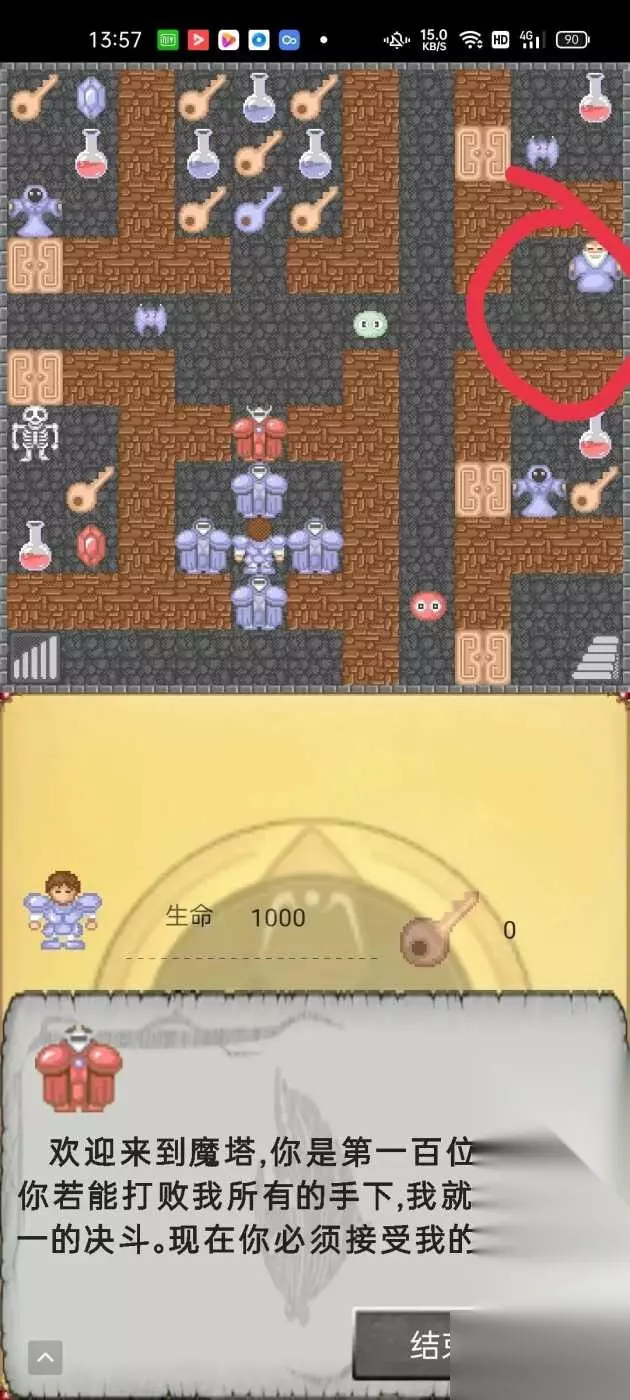 三、怪物图鉴(手册) 这个道具在魔塔第3层,和下图所圈的蓝色老头对话获得,作用是能显示出这一层怪物的属性以及你打赢怪物需要扣除的血量,非常实用。