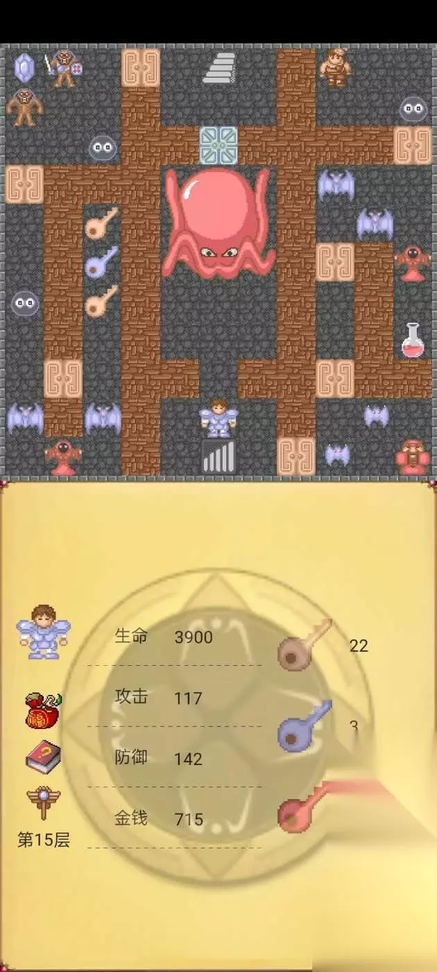 四、镐 这道具在魔塔第15层打败这次大章鱼以后可以获得。作用是用来获得圣剑,因为圣剑的墙是坏的。