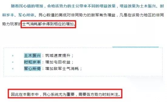 一、民心系统 最初的预告中就已经放出了民心系统的部分消息,这次有更加详细的内容放出,以及一些值得留意的话语。 三战一直都是用打造最真实历史的口号,并且也在游戏中做到了。笔者认为,“得民心者得天下”这句话也有大概率在游戏中复现。但值得一提的是,这句古话,个人觉得,更应该说成是“得民心者更易得天下”,至于到底打不打得下江山,还是得看各方势力的努力了。历史上就是这样,游戏中亦是。 关于民心的介绍,预告已经很直白了,在此不作赘述,就重复一条重要的【每个郡的民心值单独计算】。 同时,笔者大胆猜测,虽然预告没有明说,但根据字里行间,我觉得【民心八成是一个渐变的进度条,而非固定的,就像随时间增加的名声一样,只不过会减少罢了】,这里提到的【经营情况,就是增加多少或者减少多少的风向标】,同时【经营情况再由码头、城池、军屯来决定】。那如果是个渐变的效果,就意味着想要降低民心,不可一蹴而就,是一定要经历一定时间的。(PS:这也更符合,民心一词的含义) 下面说下民心系统下的游戏机制: 民心值增减:抛开军屯不谈,打城、打码头,也是可以提升民心值的。这意味着,在本身攻城略地的情况下,就自然会影响民心,并且【在进入敌方领地时,作战难度会上升】,因此【城池、码头的争夺,尤其是城池的争夺将变得更加重要,将在“方便调动”的基础上,增加民心值上升这一要素】 民心值效果:看起来就像一个随时变动的进度条,增加到某个值就给你利于防守的效果。但同样的,若减少到某个值以下,笔者认为得到的效果也会随之而去。因此【争夺民心,在游戏中就体现为争夺民心所提供的效果】。就像抢红、蓝buff大小龙一样233。因此民心会更利于我方作战。 民心效果的战略角度: 下赛季由于势力间两两接壤,并且霸业值由城池决定,因此踏入其他势力领土范围肯定是难以避免。 从进攻的角度来讲,进入敌方领地的首要战略目标应该是使民心开始降低,尤其是使“加快我方士气消耗”这一不利推进的效果消失。手段方面:攻占【所有】码头封路,一方面不知道拆军屯是不是可以降民心233(个人觉得即使可以,每个军屯能影响的民心增减速度应该也相当有限)。当然了,如果有条件,第一时间攻占城池,自然是最为有效的推进方式(但想要快速拿下有主城池,是有一定难度的)。同时,【进攻的另一面就是固守,得到了还要守得住才是自己的】,因此,快速把民心的三个效果纳为己有,将客场作战转变为主场作战,也是十分重要的。此外【进驻中部无主之地时,民心的争夺也会显得比较胶着】 从防守的角度来讲,我方开局应第一时间打通各码头,将民心上升的势头拉到最大,尽快解锁屯田收益以火速开荒。同时在边境注意防止入侵,这样随着时间,我方将以最快速度拥有民心的三个效果更加便于防守。开疆扩土的要素之一也是保证自己领土不被侵占。 个人觉得,搞不好在前期民心还未达到降低敌军士气时,可能就已爆发边境战斗。