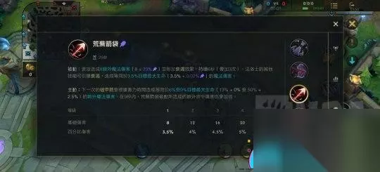 二技能:死亡之吻 被动:普攻附带8额外魔法伤害(8+20%AP)并附加枯萎效果,持续6秒(可叠加3次)。韦鲁斯的其他技能可引爆枯萎效果,对目标造成相当于其3.5%最大生命值的魔法伤害。 主动:下一次的破晓之箭将根据蓄力时间对目标造成额外的魔法伤害,数值相当于其6%至9%最大生命值(13%+0%至50%+2.5%)。在9秒内,死亡之吻被动所造成的额外命中伤害效果将加倍。