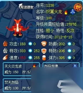其魂印每回合10%概率的烧伤算是锦上添花,毕竟这个时候的魂印还是技能的陪衬,那时候的精灵真正要看的还是种族值和技能组是否优秀。 话不多说,我们就先来看看种族值。炽翼火龙的种族值总和为600,而且种族值分配真的好,分配之后的种族值各方面都是十分全面的分配,这种分配还恰到好处,不至于浪费。