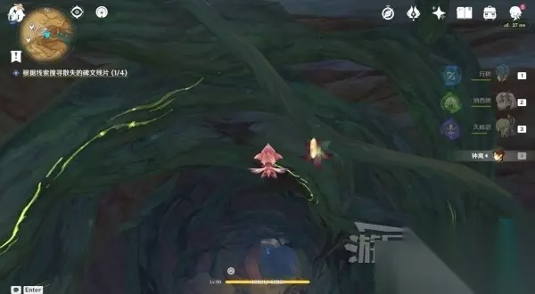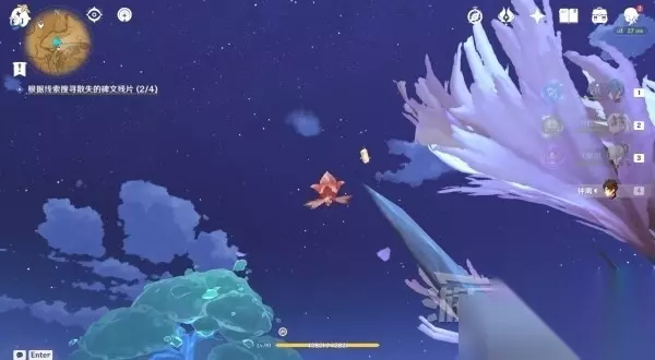 参考上方位置图,序号②的残片可以从地图左侧传送锚点出发,在山崖处使用斯露莎,操作斯露莎往山崖下方飞,就在树藤旁边。