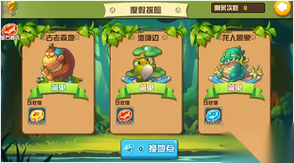 度假探险每天挑战几次可以用钻石刷新第一次不用钻石。获得的宝石可以在宝石商店里面换碎片等道具