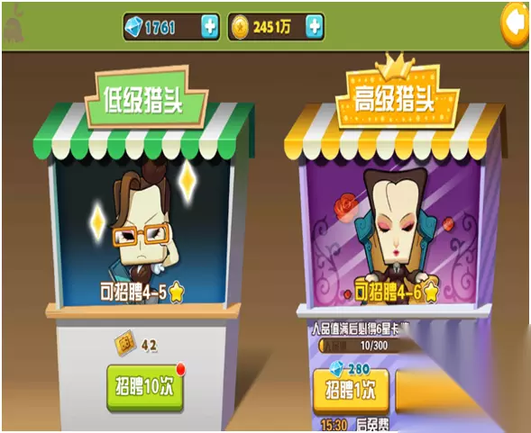 (5)星座 星座是通过闯关所获得的道具来解锁星座格子。星座格子是提升主角的属性。成长率还有阶级 (6)背包 背包就是玩家在游戏里面获得的道具。转生道具。符文,宝石。碎片都可以在里面看到 (7)召唤 召唤顾名思义就是召唤英雄,张小盒里面是叫招聘英雄。当然是有10连抽的,分低级招聘和高级招聘。低级招聘最高可以招聘到5星英雄。高级招聘最高是可以招聘到6星英雄的。高级招聘每一次需要280钻石,10连抽是9折需要2520钻石。