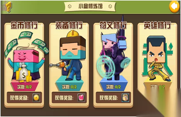 小盒修炼馆分为金币修行,装备修行,符文修行和英雄修行。分别获得金币,锻造石,符文和进阶石。每天各种修炼有两次机会。但是里面修行的难度是随着游戏角色等级的提升而开放更高的等级