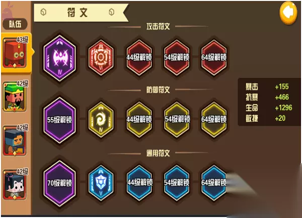 (2)符文 符文分4种类的符文,分别是攻击符文,防御符文,通用符文和精华符文,随着等级和转生等级解锁符文格