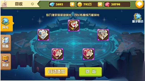 (1)回收站 回收站就是回收玩家多余的碎片,装备,还把英雄返还到最初的等级然后返还玩家部分升级所需的道具(这个功能很坑的,需要100钻石,而且返还的东西太少了练升阶的碎片都不够得,建议玩家一开始就想好自己的初始阵容,不然从新回收很费时间资源的),回收后获得的碎片装备也可以去自己的盒子商店换碎片,突破石等道具。