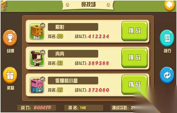 (2)竞技场 竞技场每天有10次机会和排行榜上的玩家对战(电脑AI),赢了就变成那个玩家的当前排行,而且也可以获得钻石,刷新是不会消耗其他东西的