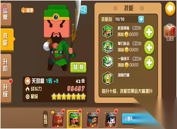 (9)英雄 英雄里面可以切换自己当前使用的英雄。也可以设置队长。可以给英雄提升等级(主角是不需要提升等级的)提升技能等级。英雄和主角都有4个技能,。但是初始只有一个技能可以使用。需要升阶才能解锁其他三个技能,升阶也要英雄达到相应的等级才可以的。升阶是用于主角和英雄的提升。提升很大的。也要提升自身的各种属性。但是英雄从+5过后就需要用英雄的碎片升阶了。招聘里面招聘到同样的英雄就会自动转化为英雄的碎片。升阶等级越高所消耗的碎片也就越高(主角从一级开始升阶就需要主角碎片) 6.总结 《我叫张小盒》这款游戏总的来说是很不错的。品质很好的。而且喜欢这种Q版画风的玩家是可以尝试下的。游戏玩法多样,比较有意思。而且比如系统,阵容克制之类的都很有讲究的,不像画风那样看上去呆萌的。这次测试做的还是很好的,当然游戏也有优缺点的。 优点:优点是游戏特色,玩法角色多样,技能还是很炫酷的。而且闯关剧情还不错,喜欢剧情的玩家也可以仔细体会一下