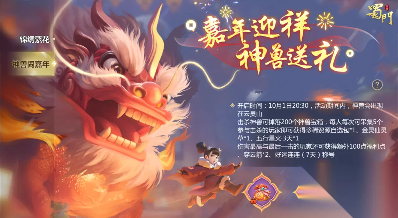 神兽闹嘉年 活动时间:2025年10月1日 晚20:30 活动内容:蜀仙盟里喜庆的氛围太浓烈,这不,神兽也想来凑个热闹。活动期间,神兽将会出现在云灵山,击杀神兽将掉落200个神兽宝箱,每人每次可采集15个。