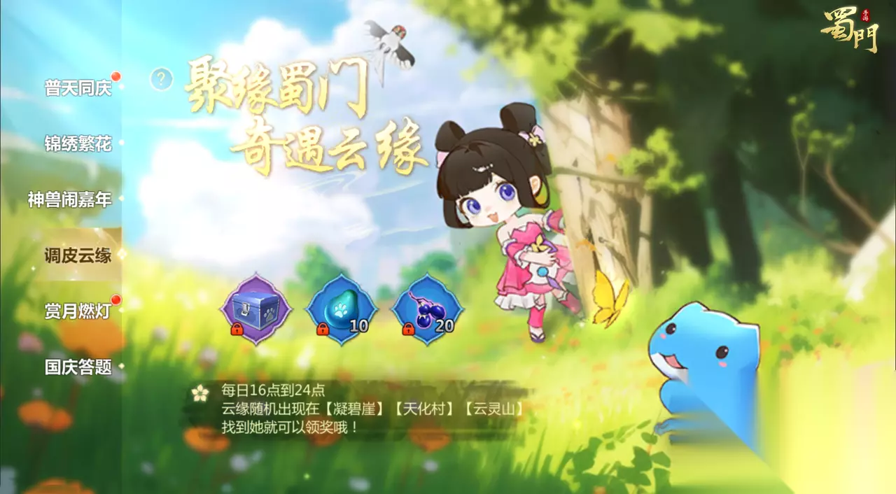 调皮云缘 活动时间:2025年10月2日-2025年10月4日 活动内容:活动期间,30级及以上玩家可前往凝碧崖、天化村、云灵山偶遇云缘,每日可参与获取奖励一次。找到云缘即可获得奖励,有仙灵口粮、云缘馈赠包*1及紫玄果相送。