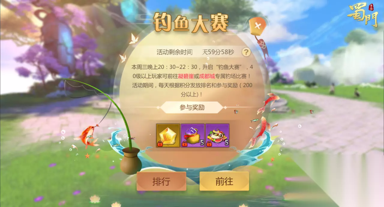 钓鱼大赛 活动时间:2025年10月6日晚20:30-22:30 活动内容:活动期间,可前往凝碧崖或成都城专属钓场比赛, 在钓鱼大赛中不消耗鱼竿耐久也不消耗鱼饵,所以带上最好的鱼竿去征程吧。