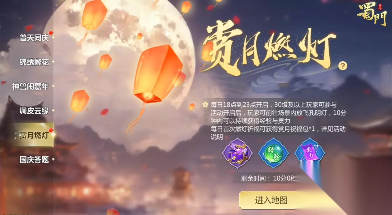 燃灯赏月 活动时间:2025年10月5日-2025年10月6日 活动内容:每日18点到23点,10级以上玩家均可进入活动游玩。 玩家每日可免费获得3个孔明灯进行燃灯祈福,也可以通过卖灯老板娘购买更多的孔明灯进行燃放。每日首次祈福可获得赏月祝福礼包。