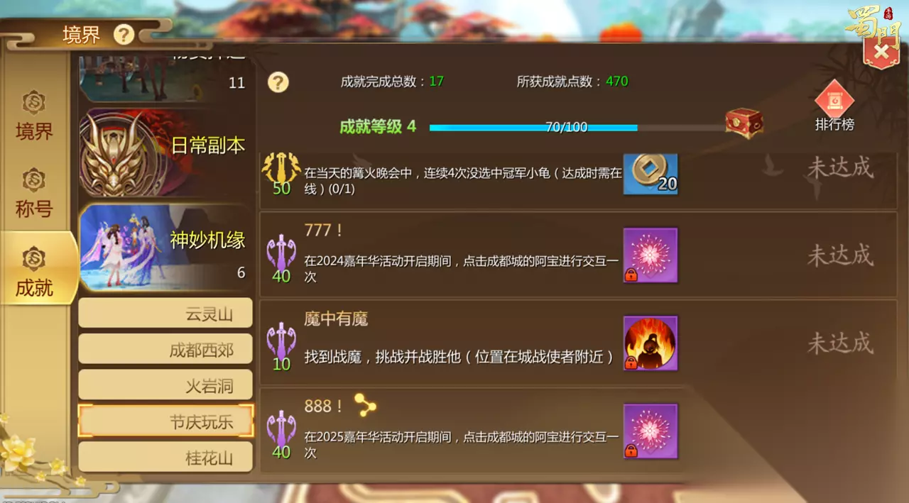 周年庆成就 活动时间:即日起-2025年10月8日 活动内容:在嘉年华期间与成都城的阿宝进行对话,可以获得周年成就!完成八周年的成就还可以额外获得时光回溯道具,使用后即可解锁往年嘉年华的限定成就!