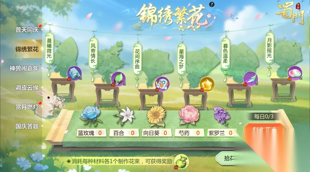 锦绣繁花 活动时间:2025年10月1日-2025年10月8日 活动内容:完成指定拾花任务即可获得花艺材料包,打开可以从5种花朵中随机获得1朵。收集5种花朵可制作1次花束并获得繁花福袋,每日最多可制作3次花束。活动共有6种花束,制作花束后按顺序依次激活并获得对应的奖励。 服务器等级70级及以上区服,制作3束可获得限定印花“捧场”与青云印,制作满6束还可以获得月华染*2。 服务器等级50-65级的区服,制作3束可获得红焰狐仙腰饰,制作满6束还可以获得完整光芒石*2。