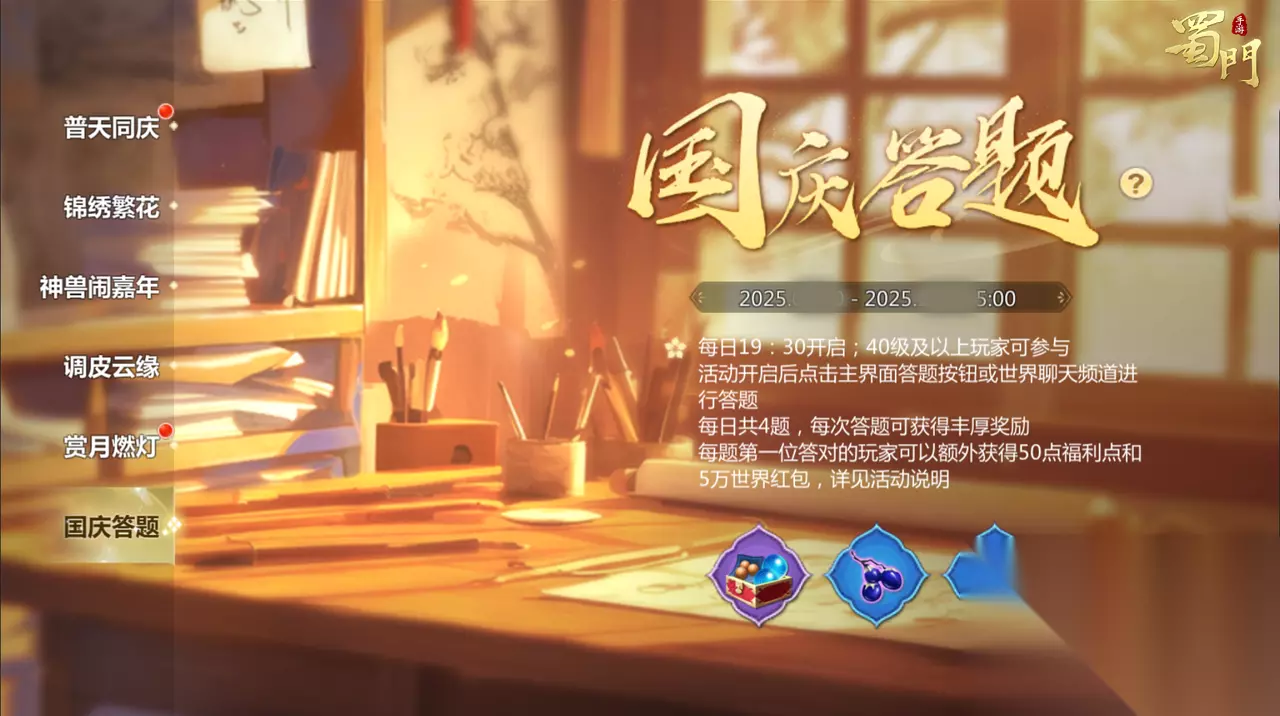 国庆答题 活动时间:2025年10月6日-2025年10月8日 活动内容:活动开启后,可通过点击主界面答题按钮或世界聊天频道进行答题,每日共4题,参与即可获得仙灵养成自选包、仙魂与紫玄果。每题第一位答对的玩家还可额外获得50福利点和5万绑银世界红包。
