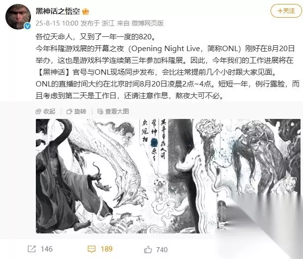 8月15日,黑神话:悟空官方账号发布最新消息,宣布将在8月20日科隆游戏展开幕之夜(Opening Night Live,简称ONL)期间,同步公开游戏的最新开发进展。 这是游戏科学团队连续第三年参与科隆游戏展,而“820”这一时间节点也早已被国内玩家熟知,因此此次发布消息一经公布便引发广泛关注。 根据官方透露的信息,最新的开发进度将在北京时间8月20日凌晨2点至4点,通过ONL直播及黑神话官方渠道同步发布。由于直播时间较晚,官方也特别提醒玩家合理安排作息,不必刻意熬夜观看。此外,官方表示,与往年相比,今年的发布时间有所提前,主要原因是与科隆展整体日程安排有关,此举也有助于全球玩家在同一时间获取最新内容。