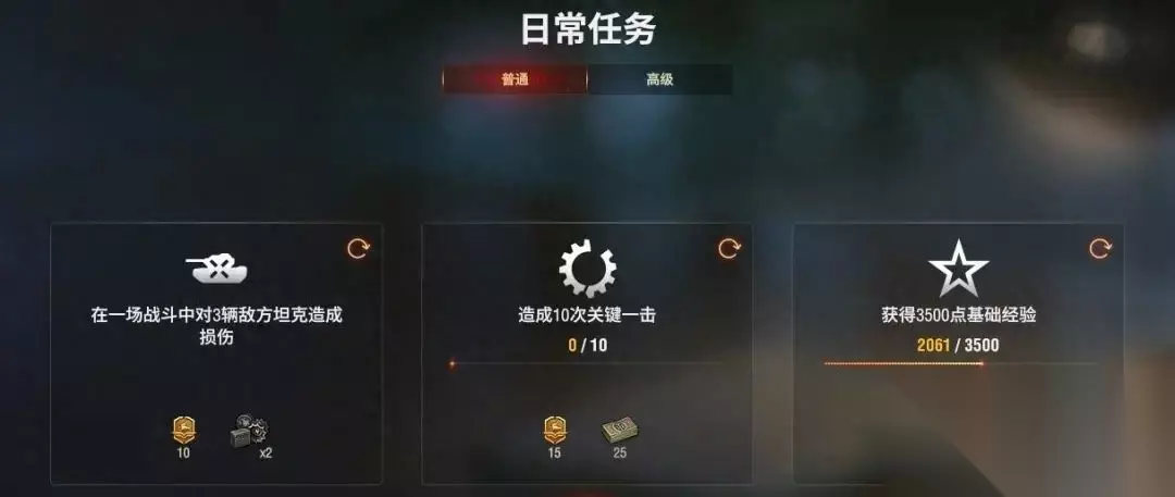 ▲普通日常任务 由于车长们的账号资源、研发进度不同,因此将会分为基础与进阶两种,基础坦克推荐选取的多是非常亲民的可研发坦克,或是毫无入手门槛的金币坦克,进阶坦克则对玩家的操作要求更高一些。首先是日常任务推荐车,可以选择以下基础坦克: T-34 KV-1 M10“狼獾” T67 上述4台坦克均为V级银币坦克,入手门槛非常低,而且坦克的完全体性能优秀,富有历史底蕴,无论是用来收藏还是用来完成日常任务绰绰有余。