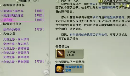 瞿塘采仙草同样奖励3000,做完每日大战茶馆+入帮后的奖励1w,再做几天的美人图就可以换得一件装备,同时美人图奖励1500侠义点数。