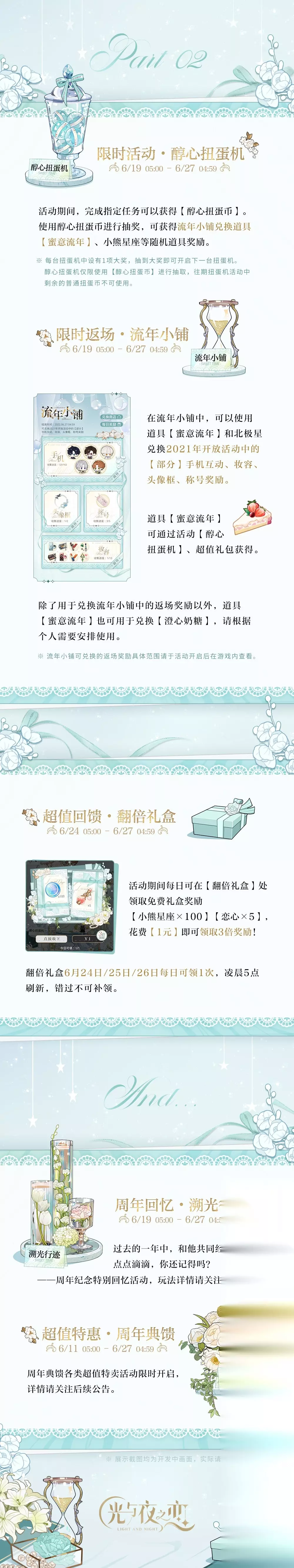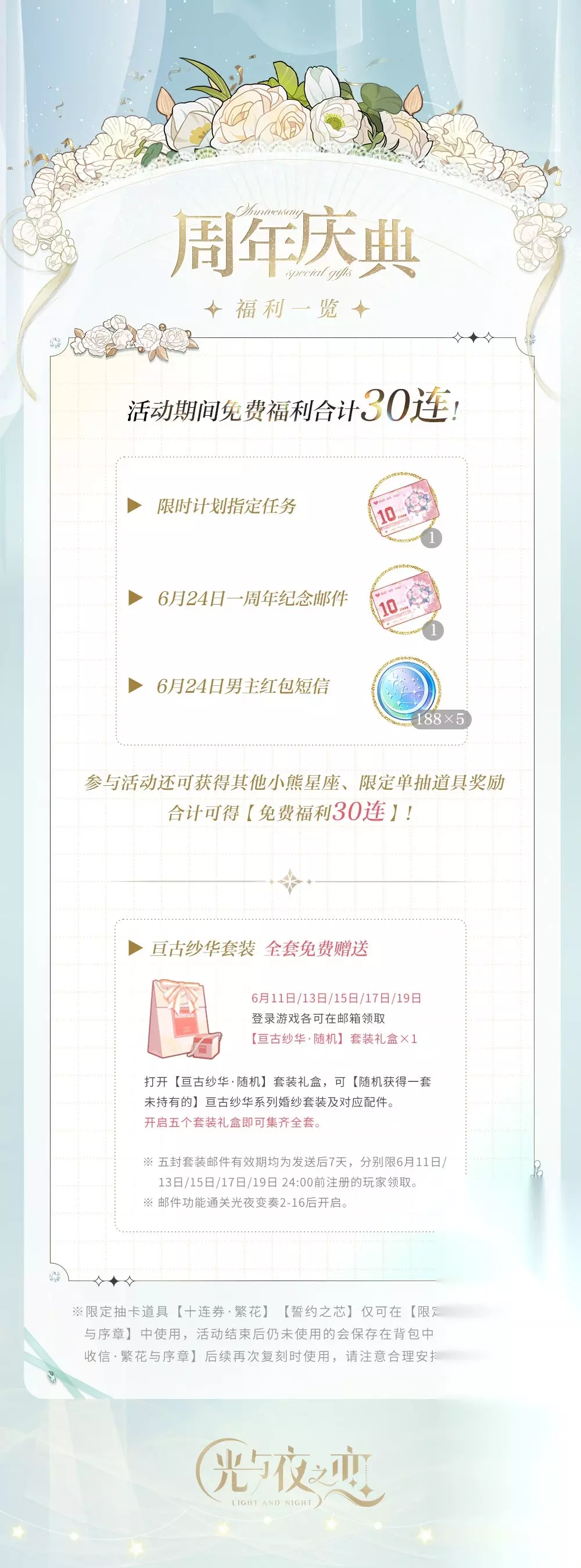 婚纱是免费的了!不知道鹅的下一步补偿会是什么(思考)? 《光与夜之恋》周年庆典福利2022 福利一:限时计划指定任务【十连券・繁花×1】 福利二:6月24日一周年纪念邮件【十连券・繁花×1】 福利三:6月24日男主红包短信【小熊星座188×5】 注意:参与活动还可获得其他小熊星座、限定单抽道具奖励,合计可得【免费福利30连】。 福利四:亘古纱华系列套装获取方式调整为【邮件免费赠送全套】 领取方式:6月11日/13日/15日/17日/19日登录游戏,各可在邮箱领取【亘古纱华・随机】套装礼盒×1。打开【亘古纱华・随机】套装礼盒,可【随机获得一套未持有的】亘古纱华系列婚纱套装及对应配件。 *开启五个套装礼盒即可集齐全套。 有效期:五封套装邮件有效期均为发送后7天,分别限6月11日/13日/15日/17日/19日 24:00前注册的玩家领取。 福利长图一览: