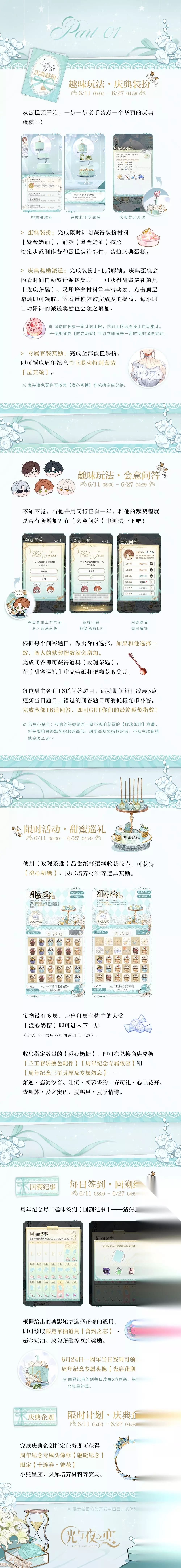 周年庆典活动 周年庆典时间:2022年6月11日~6月26日 1.兰玉联动特别套装 在【庆典装扮】玩法中装扮庆典蛋糕,完成所有装扮即可领取周年纪念兰玉联动特别套装【星芙颂】。 在【甜蜜巡礼】中收集大奖【澄心奶糖】,可在兑换商店兑换套装换色配件。 2.周年纪念三星灵犀 在【甜蜜巡礼】中收集大奖【澄心奶糖】,即可在兑换商店兑换周年纪念【三星灵犀及专属勿忘】——萧逸・恋海汐音、陆沉・朝暮誓约、齐司礼・心上花开、查理苏・爱之蜜语、夏鸣星・夏季情诗。 3.专属妆容 周年纪念专属妆容可通过收集【澄心奶糖】在兑换商店兑换。 4.专属头像框/头像 完成【庆典企划】指定任务即可获得周年纪念【专属头像框・翩跹纪念】。 参与【回溯纪事】每日签到可获得周年纪念【专属头像・光启花期】。 5.特殊奖励限时返场 使用道具【蜜意流年】和北极星可在【流年小铺】兑换2021年开放活动中的【部分】手机互动、妆容、头像框、称号奖励。 道具【蜜意流年】可通过活动【醇心扭蛋机】、超值礼包获得。流年小铺可兑换的返场奖励具体范围请于活动开启后在游戏内查看。 活动长图一览: