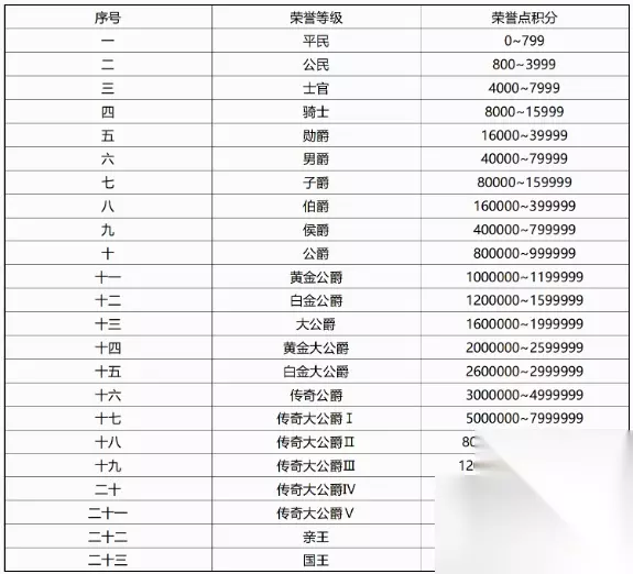 qq飞车边境荣誉等级表有什么 边境荣誉等级表: 平民:0 公民:800 士官:4000 骑士:8000 勋爵:16000 男爵:40000 子爵:80000 伯爵:160000 侯爵:400000 公爵:800000 黄金公爵:1000000 白金公爵:1200000 大公爵:1600000 黄金大公爵:2000000 白金大公爵:2600000 传奇公爵:3000000 传奇大公爵Ⅰ:5000000 传奇大公爵Ⅱ:8000000 传奇大公爵Ⅲ:12000000 每个国家边境前2-10名为亲王,共27位。 每个国家边境第一名为国王,共3位。