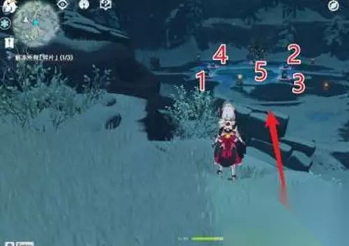 2、传送到雪葬之都·近郊,按照下图所示的顺序去解锁石柱,击败怪物后进入山洞。