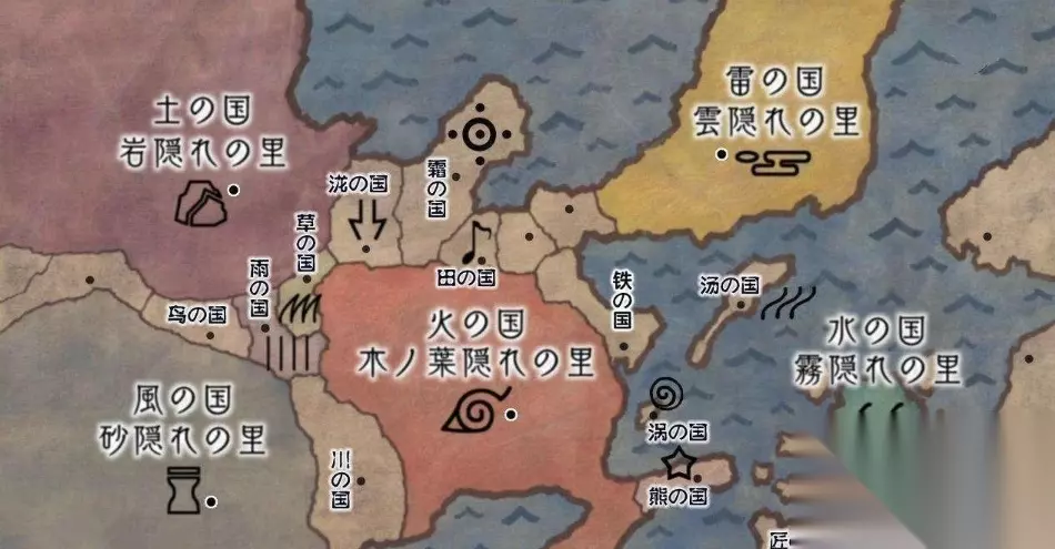 火影忍者各忍村地图板块大全介绍 众所周知,火影世界里不是只有忍村的,而是存在有各忍村依附的各大国,而主要的五大国分别为:火之国、水之国、土之国、风之国、雷之国。 五个大国实力雄厚,往往决定了忍界是否和平,并且在以往的忍界大战中,大的战争都是由这五个大国其中一个发动的。(从左至右:风影烈斗,水影白莲,火影柱间,土影石河,雷影夜月) 火之国 优质土地,森林资源极为丰厚,综合实力强盛。所以搞活动当中间人的几乎都是火之国,比如中忍考试,各种会谈上火之国的人也比较有发言权。